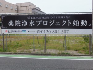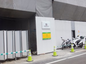 城南線とは直接連絡できるのかなと思っていたが、当然ながら広い入口が開かれている。下の工事現場が見える一角から左へ、つまり東側へ、お知らせの看板、三井住友建設の看板があり、大きなマンション物件看板が続く。