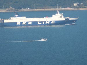 右、能古島、左、志賀島、中央の白い船は琉球海運の船舶、手前はヨットの群れ