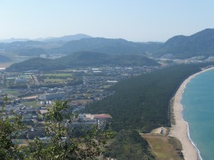 手前、野の花学園から海辺の広場にかけて、奥に向かって今津防塁のある松林、そして大原海水浴場。