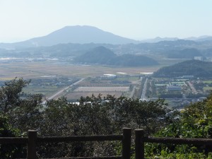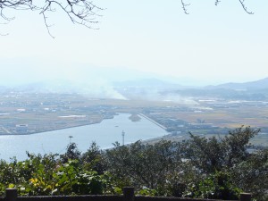 大昔、岐阜の金華山から濃尾平野を見たことがある。広かった。こっちは何十分の一だろうが、ワラを焼いているのであろう稲刈り後の田んぼを見ると、40年ほど前が思いだされますな。ところで、こちらの展望台、桜も植えられており、花見の季節は多いことだろう。