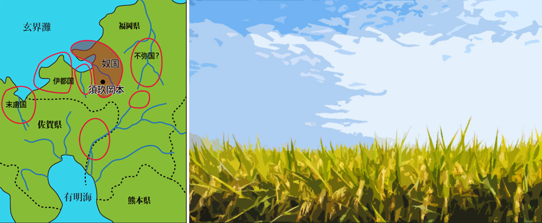 茶色の枯葉が被っている向こう、右が志賀島、左玄海島