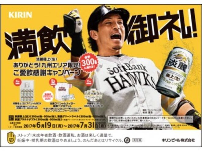 ホークス一筋11年の松田宣浩選手の「ぶれない姿勢」と、「まっすぐな生き様」を「淡麗」に重ねて表現しているもので、この広告展開に合わせて、キリンビール九州統括本部では、淡麗極上(生)「ありがとう!九州エリア限定!ご愛飲感謝キャンペーン」を、CMがスタートした6月19日(月)から7月31日(月)の期間に実施する。