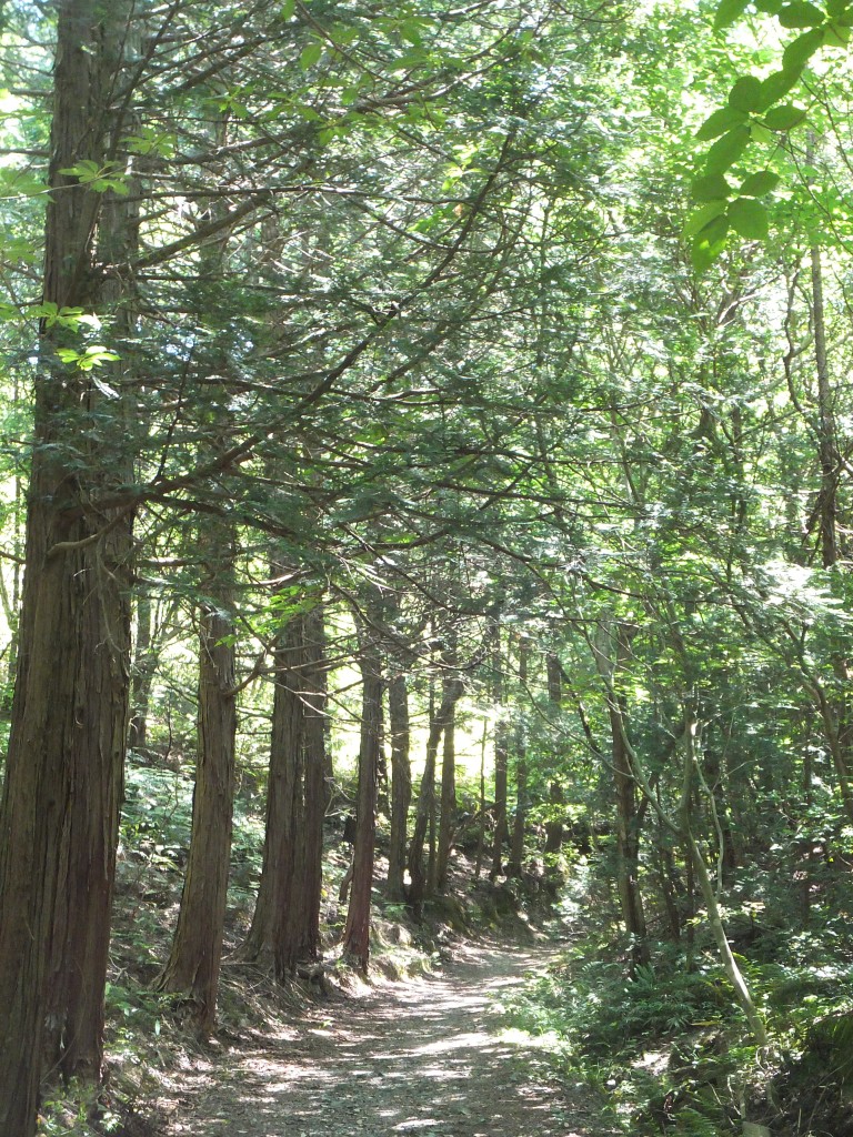 写真は登山道入口から200メートルほど歩いて、人家が無くなったあたりの今来た道とこれから行く道。