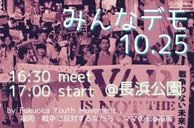 10月25日、「Fukuok Youth Movement」と、「福岡・戦争に反対する女たち」、そして「ママの会@福岡」の主催で、「安保関連法案に反対」する集会が長浜公園で開かれた。