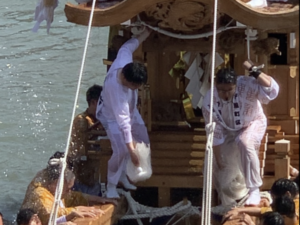 2日目も武徳殿で栄町山笠(七番)に乗り、川端町山笠(五番)で川の中へ、川に入ってから新町山笠(四番)に乗り移り、水しぶきを浴びながら指揮。