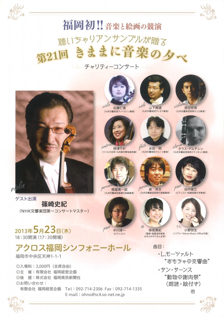 ㈲福岡経営企画が主催する、第21回チャリティーコンサート「きままに音楽の夕べ」が、5月23日(木)にアクロス福岡シンフォニーホールで開催される。