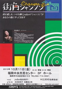 横浜を中心に、生まれ故郷の山口、また全国各地でライブコンサートを開いている yuko(松永祐子)が、身近で「言葉と音のハーモニーを」一緒に共有しましょうと企画した、「街角シャンソン」コンサートを開催する。